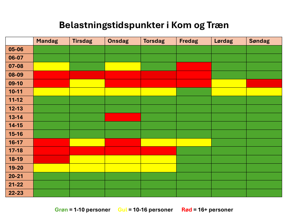 Nedenfor finder du en vejledende oversigt over tidspunkter, hvor der kan forventes øget aktivitet og flere trænende medlemmer i centret. Bemærk, at dette kan variere afhængigt af sæson og særlige arrangementer.